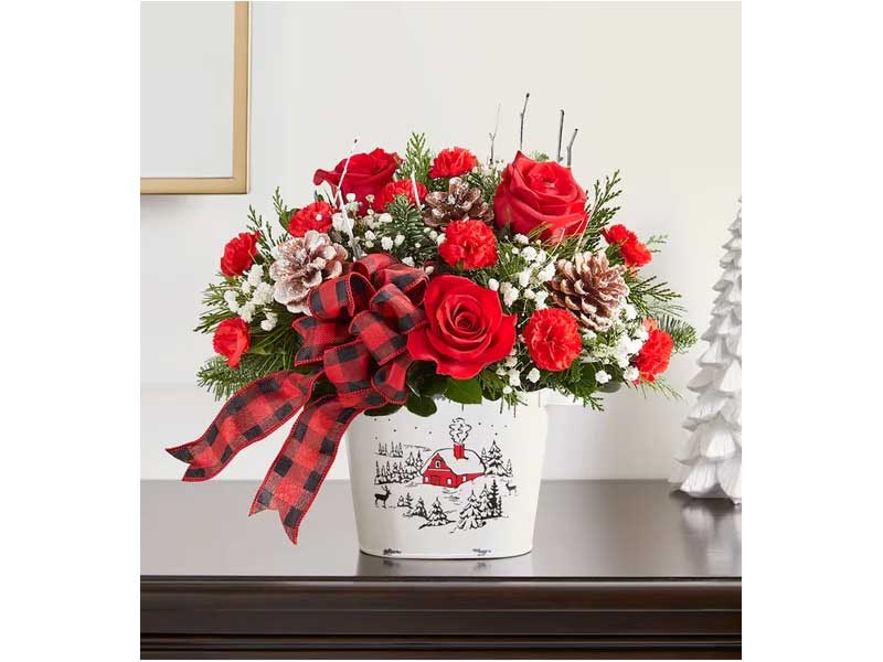 Our rustic-style bouquet is a wonderful way to celebrate the season. Red & white blooms are gathered with lush greens, snowy-tipped pinecones, birch accents and a charming plaid ribbon. Arranged in our keepsake Countryside Christmas Cachepot, designed with a milk-washed finish and featuring a quaint village scene, it’s a gift that brings the quiet enchantment of winter to loved ones near and far.